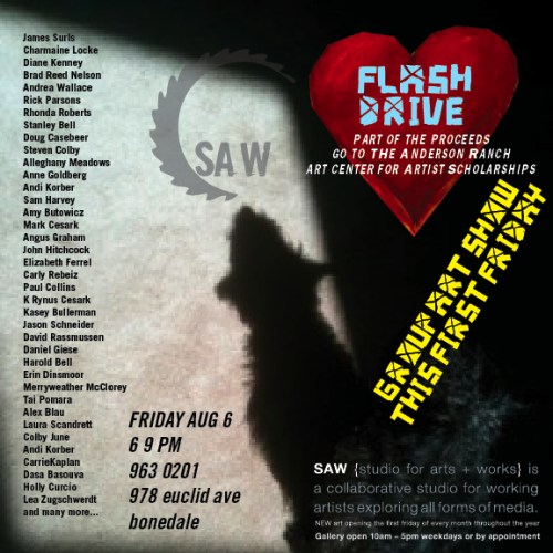 Aspen, CO, August 2, 2010–– The Studio for Arts + Works (SAW) will feature a First Friday benefit for Flash Bell and Anderson Ranch Art Center’s student scholarships. Flash Bell, one of the studio dogs at SAW, was recently hit by a car. Some of SAW’s friends have generously donated works to a group show called “Flash Drive.”